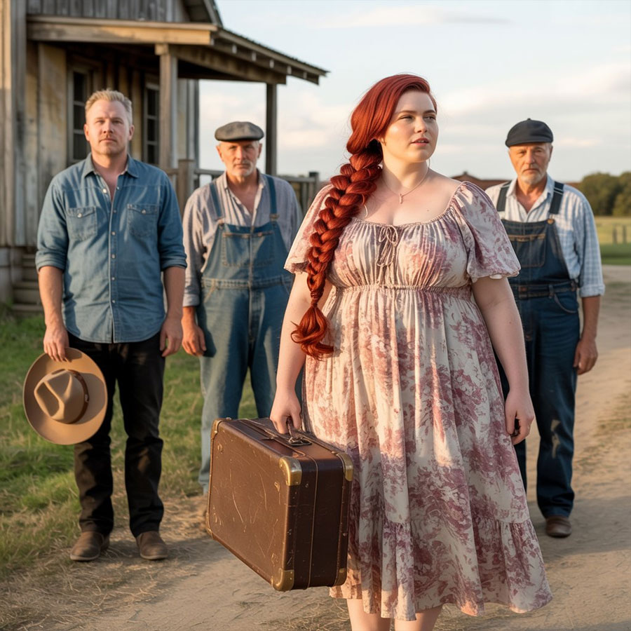 The dust swirled around the worn wheels of the old Chevrolet truck as it pulled up to the modest farmhouse in the late afternoon sun. 24-year-old Margaret sat in the passenger seat, her hands trembling as she clutched her battered leather suitcase. Her long blonde hair was braided simply, and her floral dress, though clean and carefully mended, showed signs of years of wear.