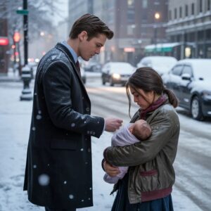 He turned. A girl stood near the curb, her hair tangled by the cold, her coat several sizes too big. In her arms she carried a small bundle, wrapped in a blanket so thin it barely held together. “My brother’s hungry,” she said softly. “Just one box of milk. I’ll pay you back when I grow up.”