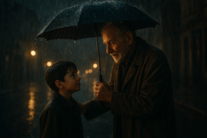 As he passed the awning, his dim eyes suddenly fixed. He saw the boy. The old man, who had lived a lonely life, felt a sharp pang of pain in his heart. He stopped his cart and slowly approached. “Hey, child,” his voice rasped from age and exposure. “Why are you standing here alone in the storm?”